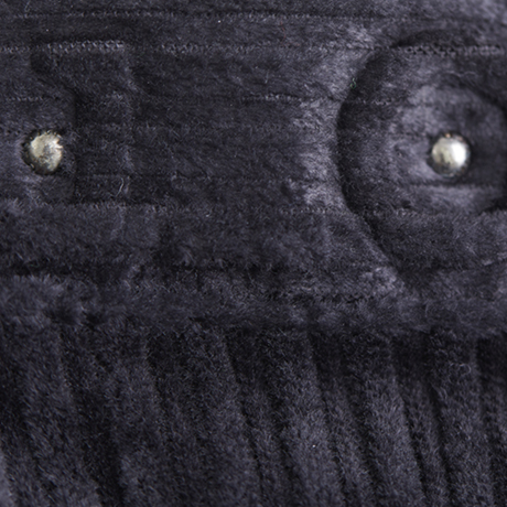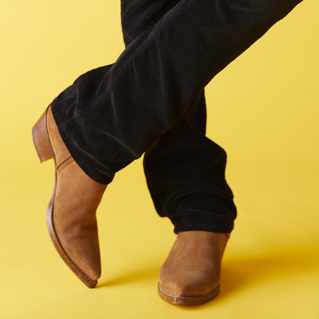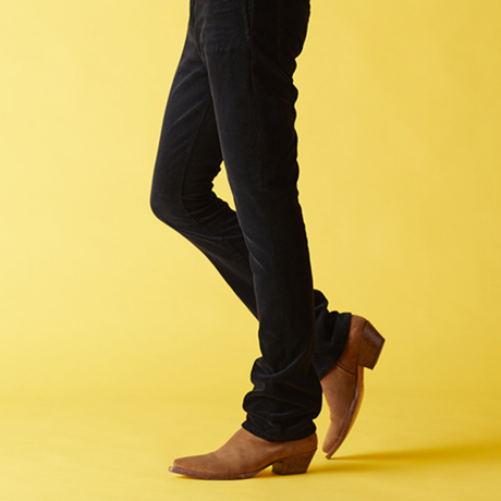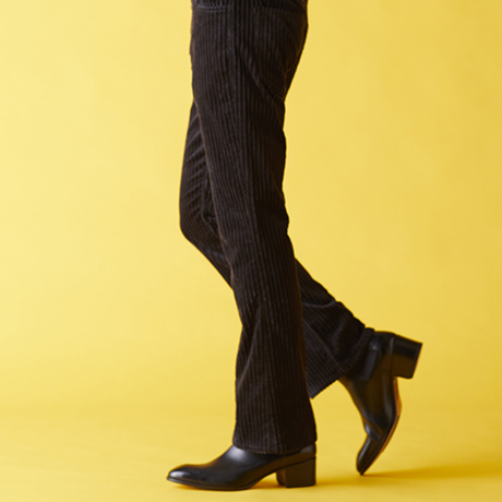 5ポケットのコーデュロイパンツの足元にあわせたのは、ポインテッドトゥ&スタックヒールのスェードブーツ。裾のくしゅっとしたたまりも絶妙で、アンクルブーツとのコントラストも……
