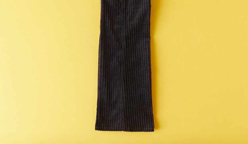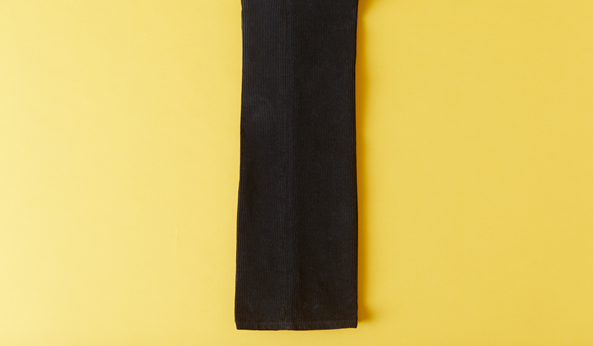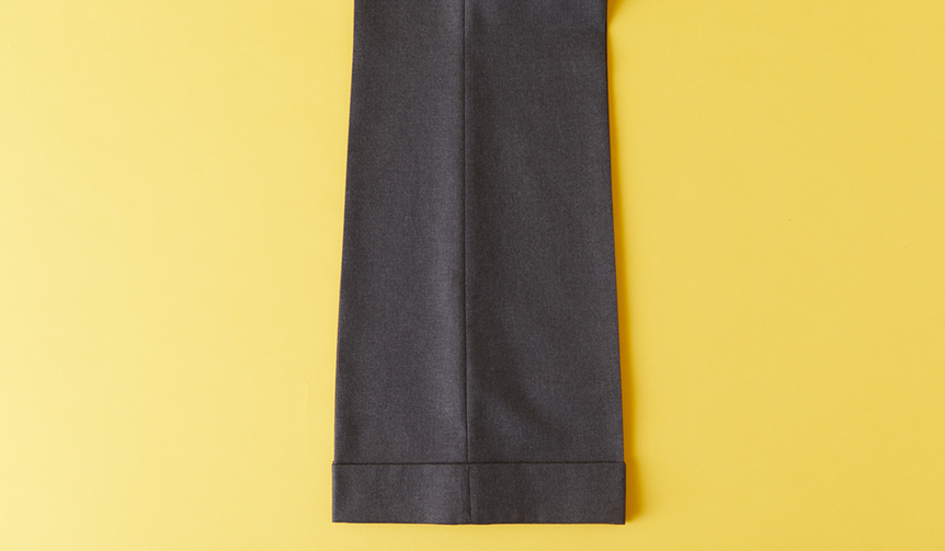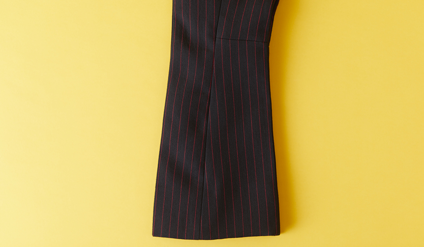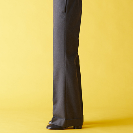 ヒップから裾にかけてのフレアのシルエットは、腰回りがフィットしていないとキレイなラインが出ないもの。フレアパンツはハイウエストのものが多いのですが、そこをあえてズラして穿くということはしないほうがいいでしょう。ヒップラインがくっきりと出てこその流麗なシルエットですから、サイズのあったものをジャストウエストできちんと穿くのが基本です。