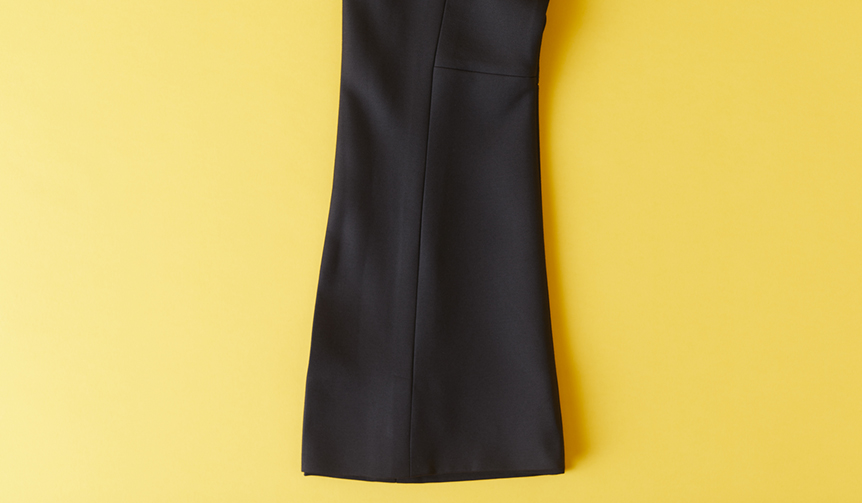上記のストライプパンツの黒無地バージョン。キックバック感のあるフレアシルエットに、やや光沢のある素材がシックな佇まいをプラス。短めの丈に仕上げれば……