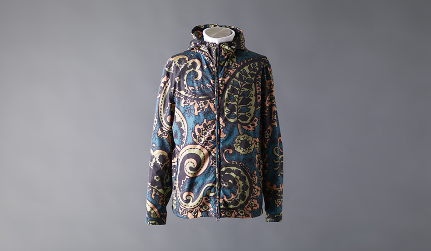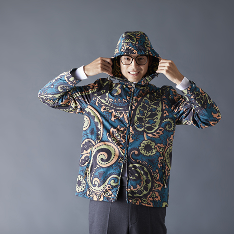 デフォルメしたペイズリー柄がインパクト満点のナイロンフーディは、ダイナミックなコンポジションとマットな質感がアーティスティックなムードをアピール。落ち着きのあるカラーリングなので……