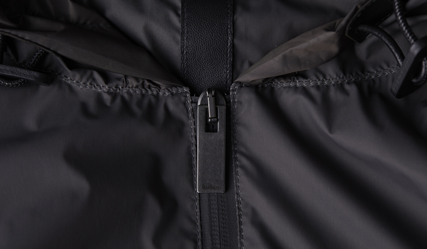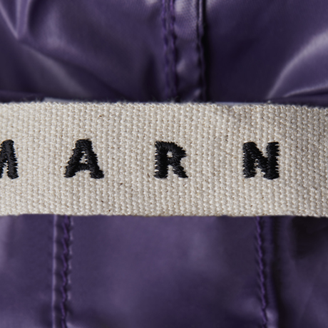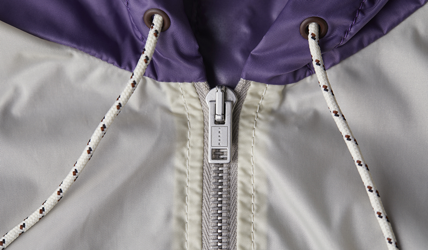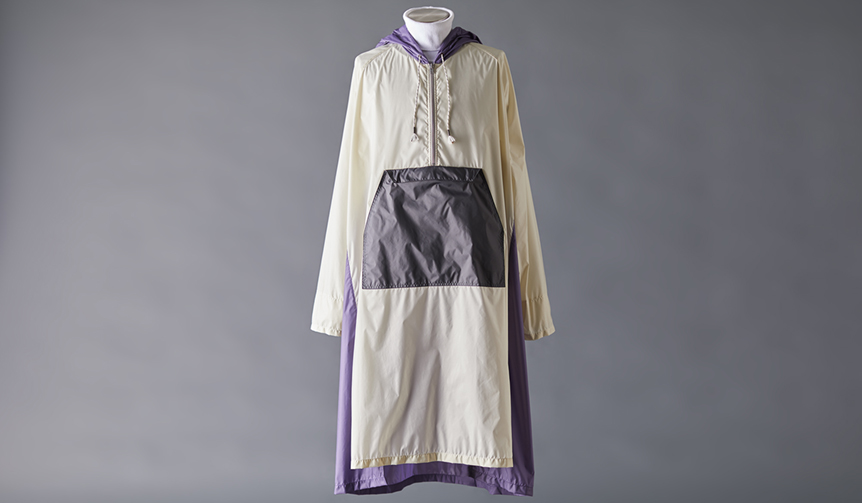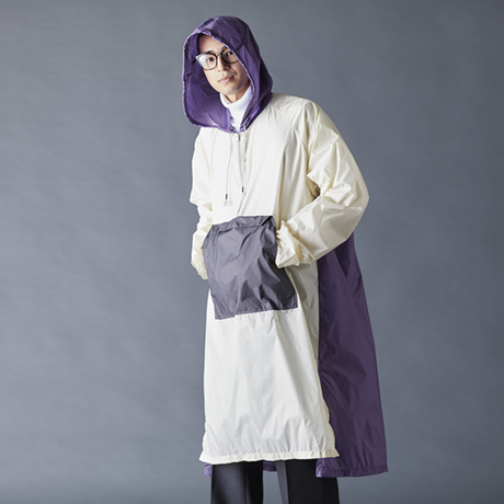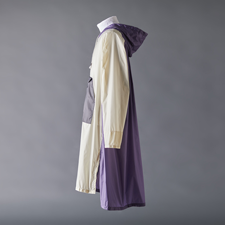ベージュ、パープル、グレーと、カラーコントラストを効かせたロング丈のナイロンコート。袖口の内側にはゴムが入っており、表面はコーティング加工。裾には長めのスリットを配すなど……