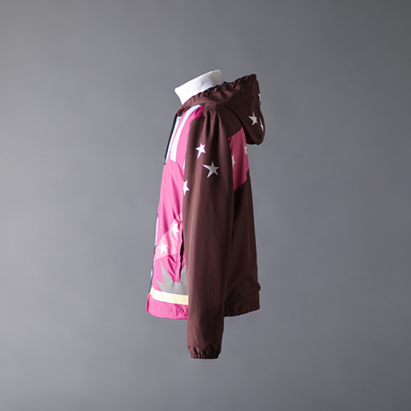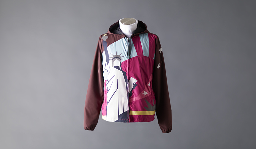 自由の女神やスター&ストライプスなどのアメリカンモチーフを、絶妙な色合いと切り替えでテクニカルに配したポリエステルブルゾン。ピンクやイエローなどの……