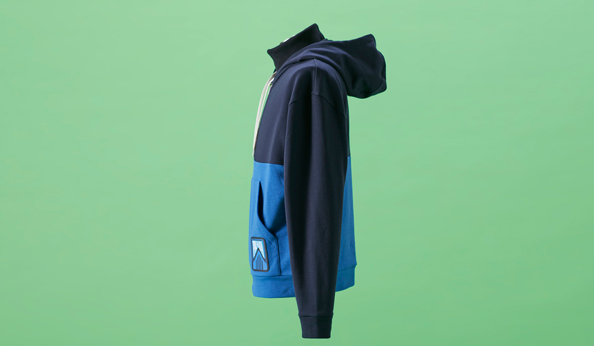 ネイビー×ブルーのバイカラーがモダンなスウェットフーディは、胸元にファスナーをあしらったプルオーバー仕立て。カンガルーポケットにアタッチされたロゴがアクセントになっており……