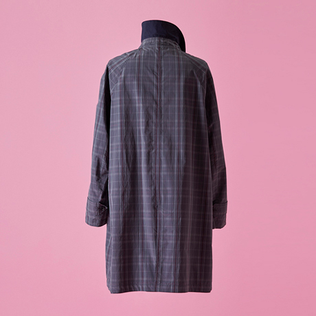 シックなグレーチェックのラグランスリーブコートは、裏面のダークネイビーの無地とリバーシブルな着こなしが可能。襟元にはDカンのストラップがついており……