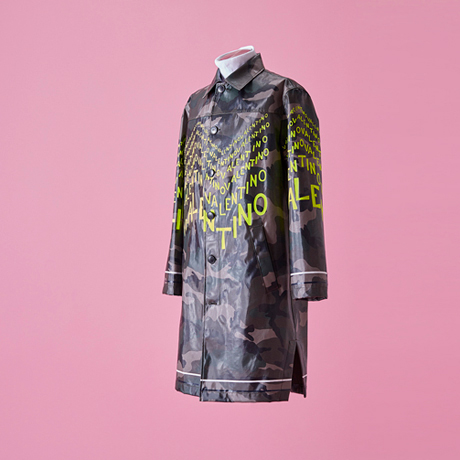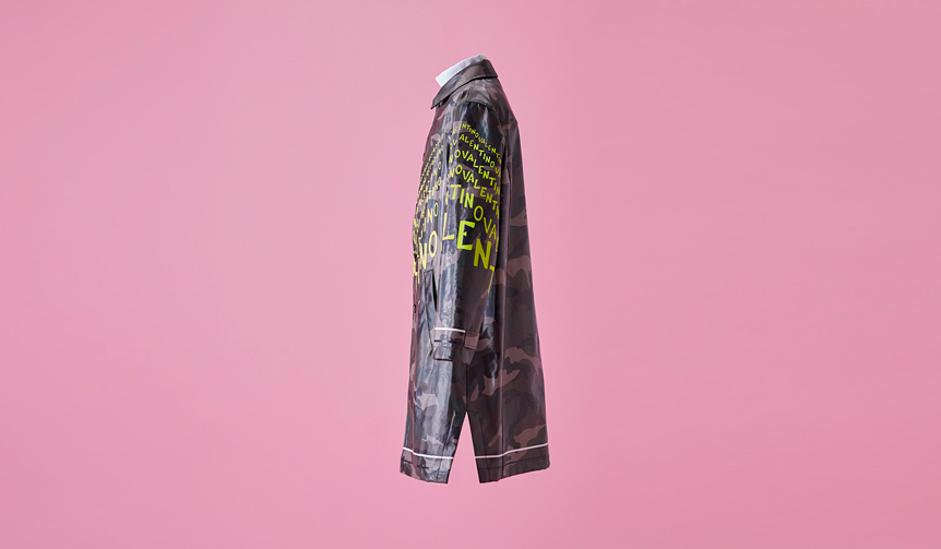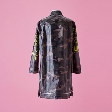 光沢感のあるカモフラージュ柄に、蛍光カラーでグラフィカルにロゴをプリント・オン。サイドスリット入りなので脚さばきもよく……