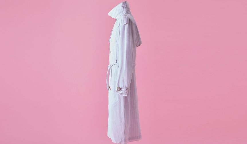 オーセンティックなトレンチコートは、オーガンジーの表地から裏地のストライプが透けて見える繊細な仕立て。驚くほどの軽さとほのかな透け感も新鮮で……
