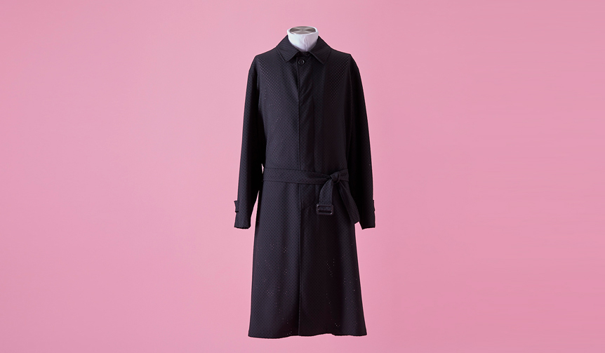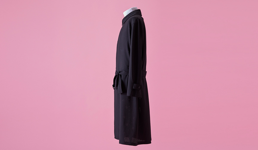 ラグランスリーブでゆったりしたサイズ感のベルテッドコートは、全面にあしらった細かなパンチングが春らしい軽さを実現。裏地のない一重仕立てなので……