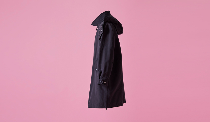 ミリタリーコートをシックにアップデートしたレーヨン素材のテクニカルフードコート。比翼の内側や襟裏に上質なレザーをあしらい、内側のウエストにはドローコードを忍ばせるなど……