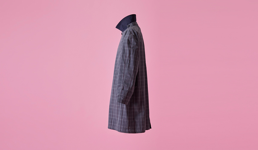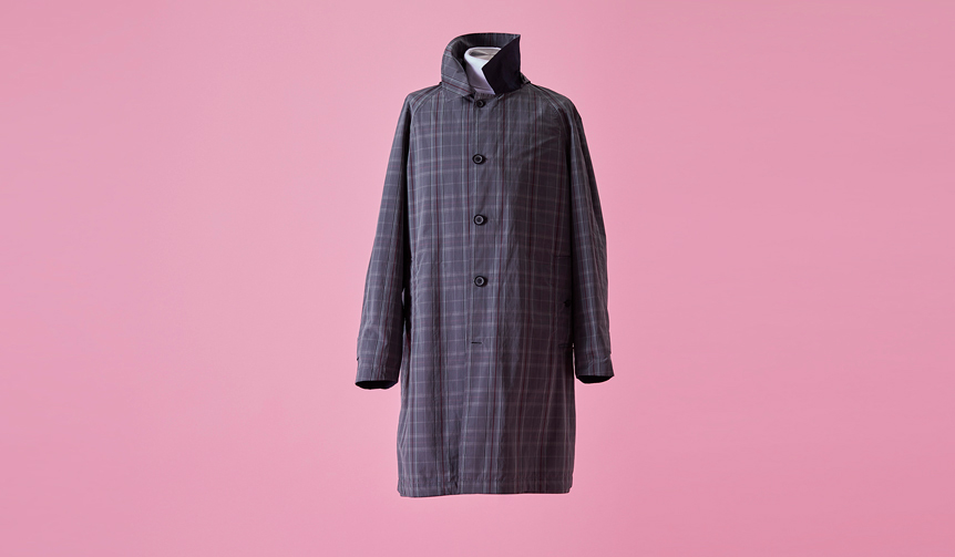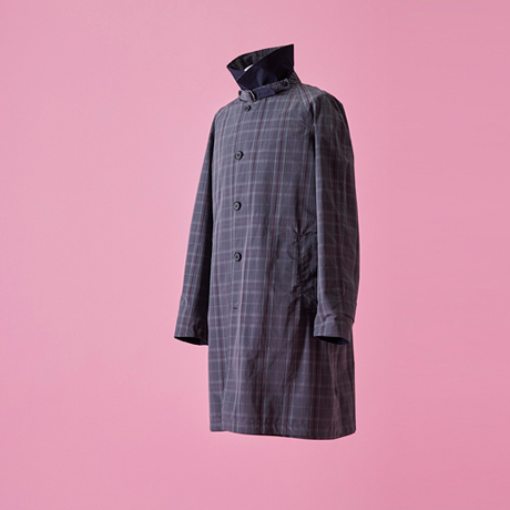 シックなグレーチェックのラグランスリーブコートは、裏面のダークネイビーの無地とリバーシブルな着こなしが可能。襟元にはDカンのストラップがついており、立ててもサマになるのもポイント。コンパクトな膝丈でどんな着こなしにもマッチしそうだ。