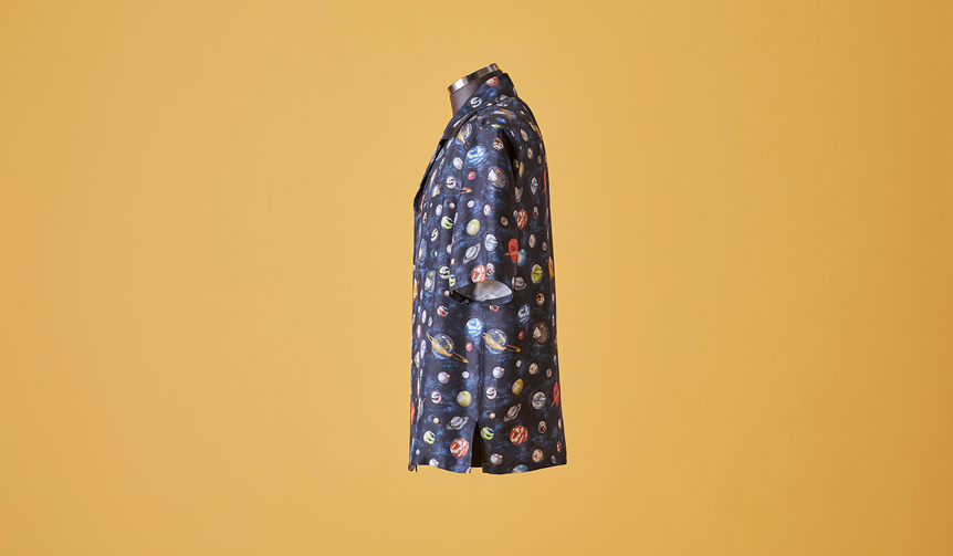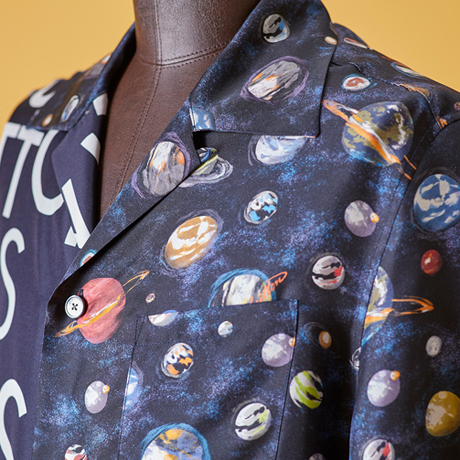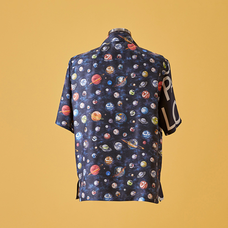 右前身頃にデフォルメしたイニシャルのデザインを、左前身頃と背中には今春夏のアイコンでもあるカラフルな惑星モチーフ柄をあしらったオープンカラーシャツ。サイドはスリット仕立てで、春夏らしいリラックスしたムードが加わっている。