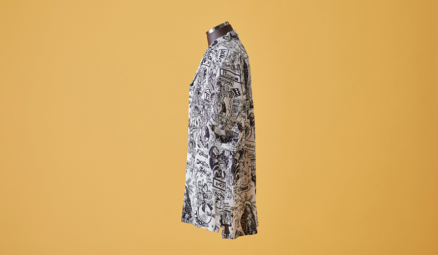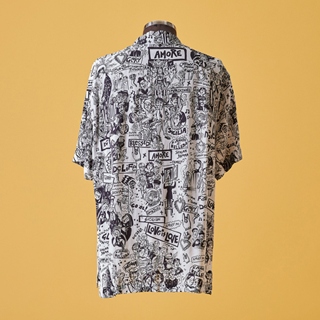 ブランドのDNAであるシチリアの伝統モチーフを、ポップでプレイフルなイラストにしてプリント。ヴィスコース素材が肌にさらりと心地よく、サイドスリット入りのリラックスフィットが開放的なムードをプラスしている。