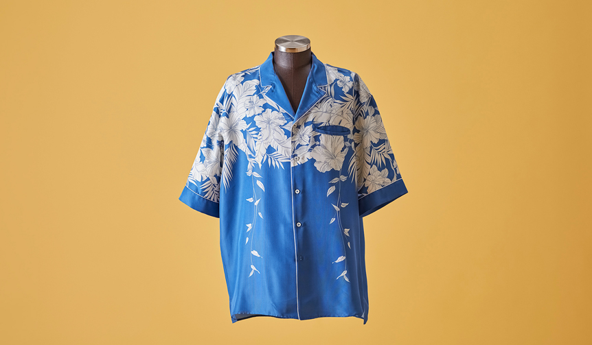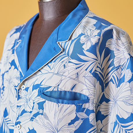 身頃の上部に可憐なハイビスカスのモチーフがダイナミックにあしらわれたオープンカラーシャツ。シルクプリントならではのブルーの発色も鮮やかで、白いパイピングディテールともマッチ。オーバーフィットながらも、凛とした佇まいが美しい。