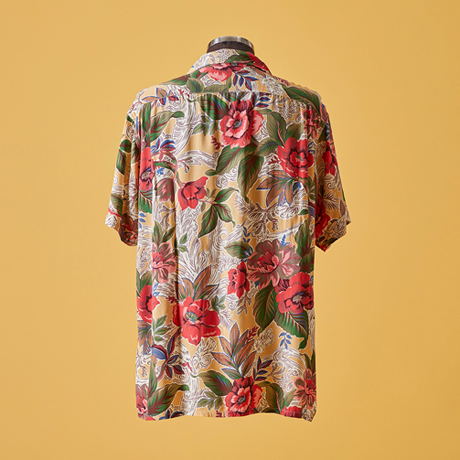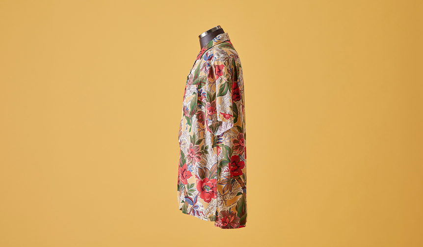 落ち感のあるとろんとした生地の風合いに、渋めのトロピカルプリントをあしらったオープンカラーシャツ。サイドスリットや胸&裾ポケット、絶妙なステッチングなど、ヴィンテージライクなルックスを際立たせるディテールの仕上げも見事。