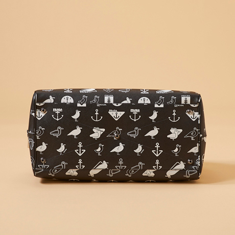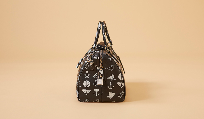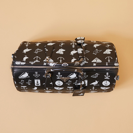 プラダのアイコンでもある「サフィアーノ」レザーを用いたボディに、カモメのグラフィックをプリントしたショルダー付きのボストンバッグ。アンカー(イカリ)モチーフが、トライアングルロゴプレートとリンクするなど、プレイフルな仕掛けも満載。ポップになりすぎないモノトーンのバランスも秀逸。
