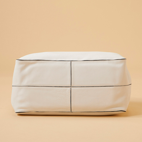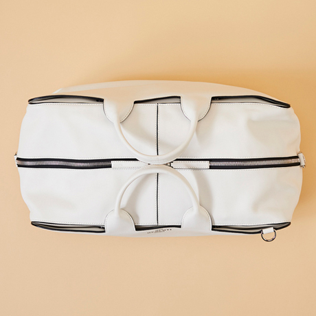 上質なホワイトカーフレザーが潔さを感じさせるキューブシルエットのトラベルバッグ。ダブルファスナーの前後にはスナップ留めのフラットポケットがついており、使い勝手は抜群。インナーにはブランドのアイコンモチーフであるカリグラフィープリントのライナーがあしらわれ、レザータグにはキーリングも付属している。新しいロゴとエッジの黒がコンテンポラリーなルックスをぐんと際立たせているのにも注目だ。