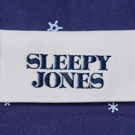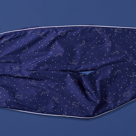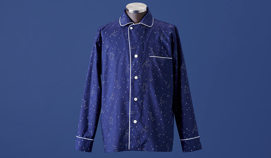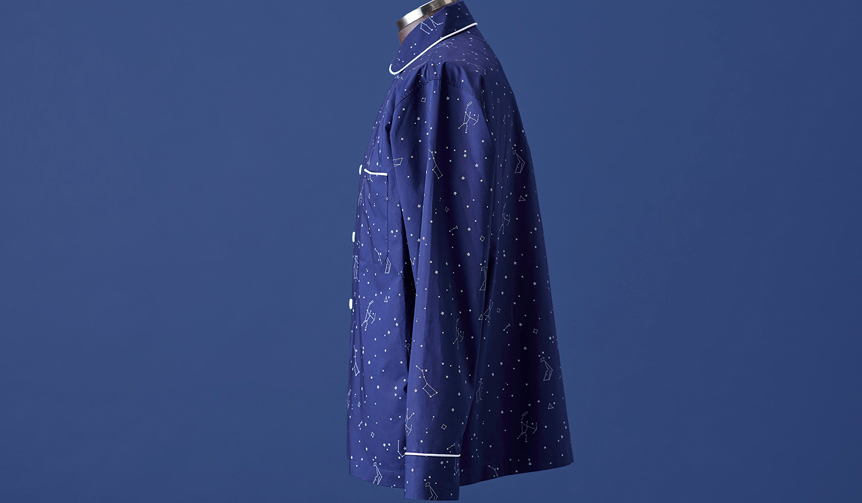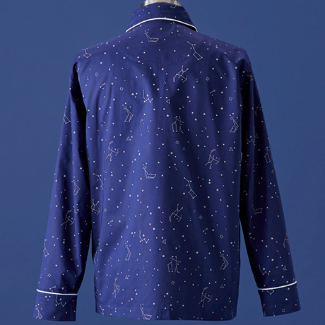 深いネイビーのコットン地に、夜空と星座のモチーフがプリントされたパジャマセット。リラックスフィットのシルエットで、ホワイトのパイピングがアクセントに……