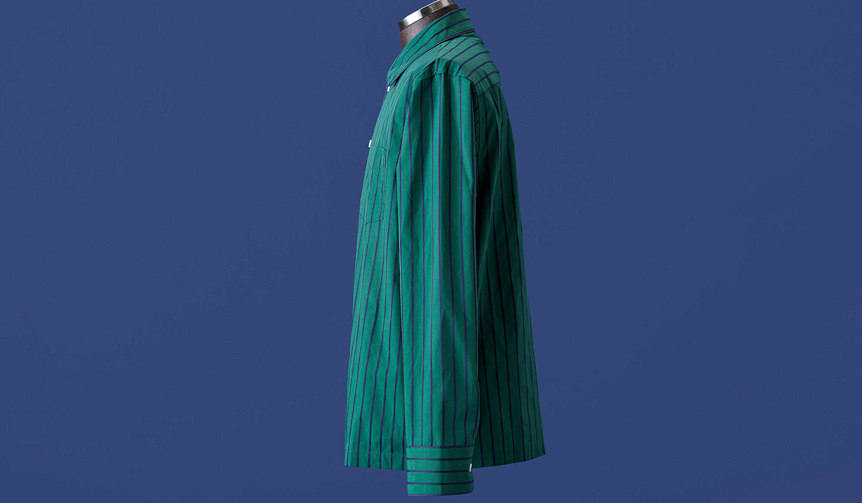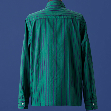 上着はシックなグリーン地にネイビーのストライプがマッチしたシャツタイプ。パイピングもストライプと同色なので柄に馴染み、スッキリとしたシルエットなので……