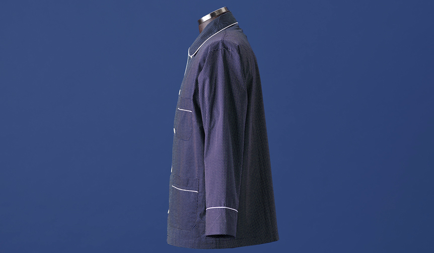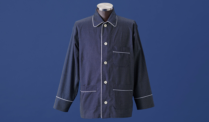 1926年、ロンドンのサヴィルロウにショップを構え、プライベートな時間を贅沢に過ごす紳士のためのスリーピングウェアを作り続けてきたデレク ローズ。ネイビーに極小のポルカドットを配した……
