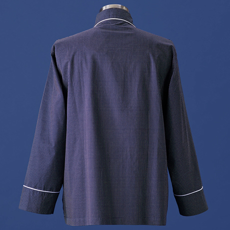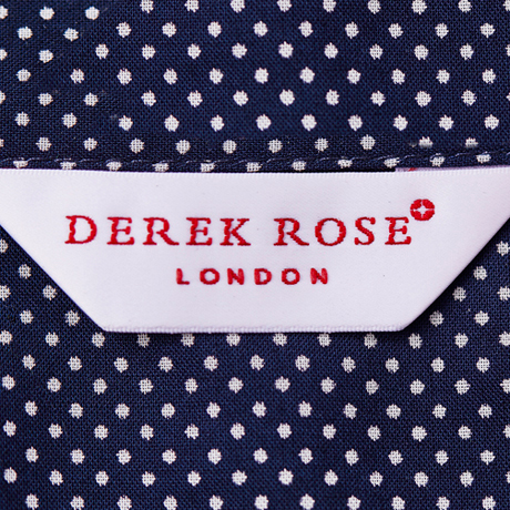 1926年、ロンドンのサヴィルロウにショップを構え、プライベートな時間を贅沢に過ごす紳士のためのスリーピングウェアを作り続けてきたデレク ローズ。ネイビーに極小のポルカドットを配したパジャマセットは、パンツのウエストが2つボタンでサイズが調整できるなど、安眠のために着心地が追求されている。