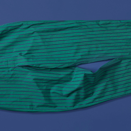 上着はシックなグリーン地にネイビーのストライプがマッチしたシャツタイプ。パイピングもストライプと同色なので柄に馴染み、スッキリとしたシルエットなので、カーディガンなどを羽織ればワンマイルウェアとしても使えそう。