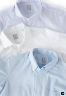 今年もメインになるのはボタンダウンやカッタウェイですね。とくに小ぶりな襟が特徴のカッタウェイは、襟もとに立体感が演出できる優れものです。また機能性素材のアイスコットンやアイスタッチなども登場し、透けないシャツが増えたのも今年の大きな傾向です。