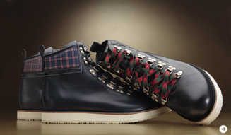 まずいちばん注目したいのは、ブルーのスエードにグレーのカーフレザーづかい、ブラックや赤のラバーをディテールに使用したトレッキングブーツ。内側にはムートンがあしらわれ、今年らしい表情だ。フロントにはインターロッキングGが配されているのもポイント。