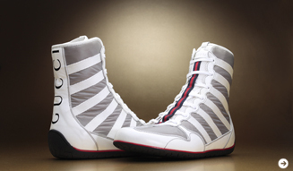 そして足もとで個性をくわえるなら、お薦めなのがボクシングシューズのタイプ。シルバーカラーのナイロンと、真っ白なレザーとの組み合わせは、スポーティかつフューチャリスティックな印象にも。フロントのウェブや、バックスタイルのGUCCIロゴも、コーディネイトにインパクトをもたらす。