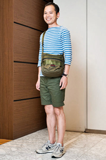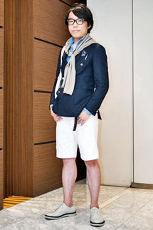撮影会当日は、6月にもかかわらずショーツ姿の男性が多く、家族連れやカップルでもショーツの着こなしを楽しんでいる男性がよく目についた。とくに“ショーツ上手”に見えたのは、フルレングスのテーパードの効いたパンツをカットオフしたようなシルエットのショーツ。素足とのバランスも良く、ショーツと靴の相性を考慮したスタイリングに好印象を感じた。