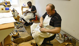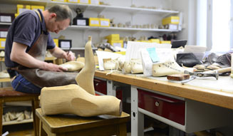靴ができあがると、マスターラストメーカーのミッシェルが革のソールの部分にロゴ印を押しに、1階の作業場へ降りて行く。その隣には、シデの木を削り込んだ木型(ラスト)が保存されている部屋がつづく。