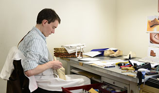パリの中心部、モガドー通りにあるビスポークアトリエの2階は、天井が高く自然光の差し込む美しいスペースだ。そんななかでジョンロブの有能な職人たちは、靴づくりの行程のすべてを分業で、手作業で進めている。