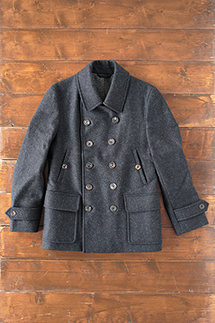 クラシックなデザインに、現代的なシルエットが融合したアイテム。フロントのボタンは通常のピーコートよりも数が多く、留め方次第で印象が変わる。ドネガルツイードを表地に、ウエストヨークシャーで製作されたコーティングウールを裏地に使用した重量感のある一着だ