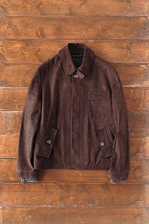 胸元のフラップポケットと、チンストラップがアクセントとなった比翼仕立てのミニマルなデザインのブルゾン。滑らかで肌触りのいいヌバックカウレザーは、ハックニーのレザーワークショップにてオールハンドメイドで作られる。深みのあるダークブラウンが上質な雰囲気を醸す