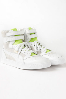クラシックタイプのバスケットボールシューズをベースにしてデザインされたハイカットスニーカー「PUMA SKY II」をkolorらしい配色でアレンジ。ホワイトのアッパーにライムグリーンのタンがポイントで、エレガントな雰囲気を醸し出す上品な一足。