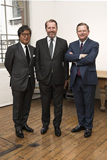 「ロンドンコレクション:メン」会場にて、左から、ジョンロブジャパン代表 松田智沖氏、ジョンロブ会長 ギョーム・ドゥ・セーヌ氏、ジョンロブCEO ルノー・ポール・ドーファン氏