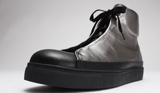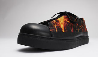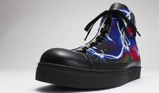 ヨーロッパの大自然からインスピレーションを受けた今季のコレクションは、虹やマグマからイメージを発展させ、服とおなじプリントを使用したレインボーパターンとマグマパターンをはじめ、レザーに箔をほどこし、独特な光を放つシルバーとレッドや、よりスポーティでカジュアルなグリッド加工がアッパーにほどこされているブラックとホワイトをラインナップ。全面黒レザーを含めた計7パターンをそれぞれローカットとハイカットで展開している。