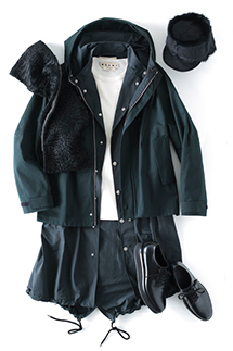 カラーではさまざまな素材感で出てくる黒に加え、赤褐色のようなカジュアルな雰囲気をもつ茶色なども見逃せない。ダークカラーを重ねて、素材の持ち味からの色の濃淡を意識するのも面白い。