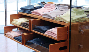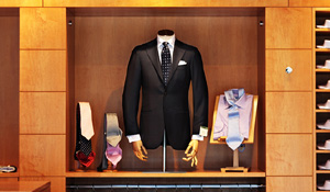 日本のフラッグシップショップならではの品揃えで、スーツ/ジャケットはサイズ44(イタリアンサイズ以下同)から52まで、パンツは44から54まで、シャツは37から43までの幅広い対応もうれしい。カジュアルラインのブルゾンは46から52、ニットは46から52までを扱う。