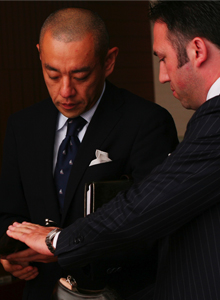 この日は、そんな注目ブランドをクリエイトするお二人、トニー・ガジアーノさんとディーン・ガーリングさんにお会いできるとあって、ちょっと緊張していました。場所はペニンシュラホテルのスイートルーム。初めてあったお二人は、所狭しと並べられたサンプルシューズのなかで、忙しそうに動き回っておられました。
