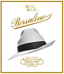 ボルサリーノは、1857年、ジュセッペ・ボルサリーノ(Giuseppe Borsalino)が、イタリア・アレッサンドリアの地にフェルト帽の芸術的職人だけを集めた工場を設立したことからはじまる。ボルサリーノのフェルト帽は150年を経た今日でも、創設時と同様な製法でつくられ、イタリアンエレガンスの象徴、ボルサリーノスタイルとしてあらたな歴史を刻んでいる。