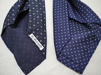 ネクタイの起源はスカーフを畳んだものと言われているが、一枚仕立てのスフォデラータの剣先裏部分の端は、スカーフのようなハンドロール仕上げになっているので、スカーフのようなソフトな風合いが楽しめ、手の込んだ仕立てが雰囲気を醸しだす。