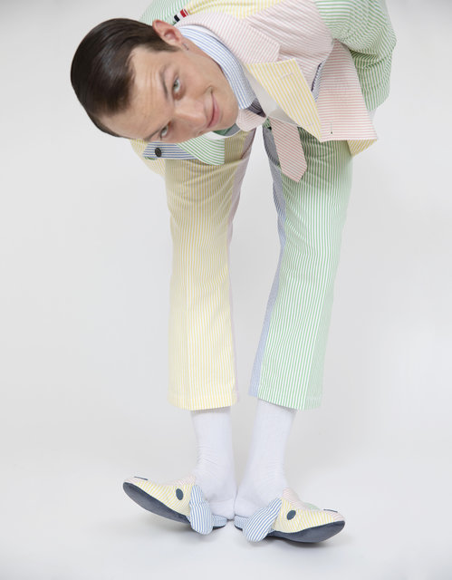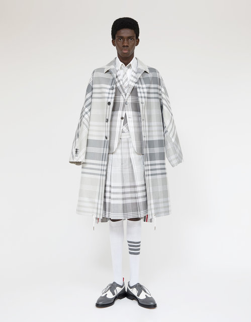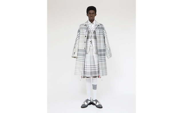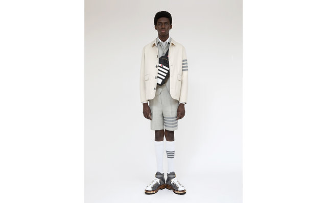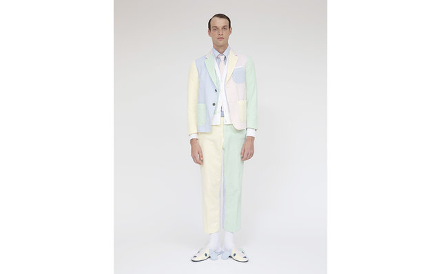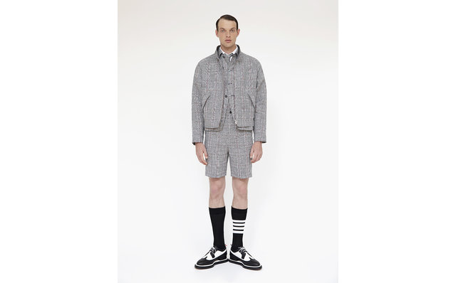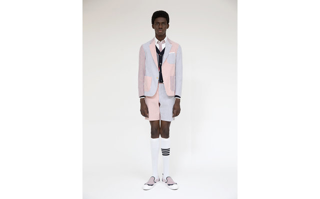 コレクションのメインとなる素材はシアサッカー。動きやすさと清涼感を兼ね備えた軽やかな肌触りは、夏の暑い時期にも最適だ。子どもの頃に初めてシアサッカーのサマースーツを着てからというもの、夏の定番として毎年愛用しているというデザイナーのトム・ブラウン。今シーズンはクラシックなテーラリングによって、シアサッカーをシャープな印象に仕上げている。