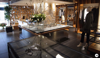 エコロジー、サステナビリティをテーマに、有機的な素材と緑のオブジェが創る積層の70坪の空間。あたらしいユーゲント・シュティール=「青春様式」(19世紀末から20世紀の初頭にかけてドイツで展開した絵画や彫刻などの様式)を表現し、現代のムードを意識した店舗に仕上げたという。