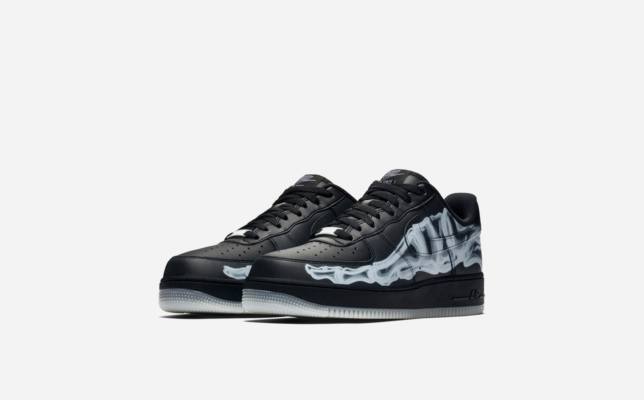 「ナイキ エア フォース 1 ブラックスケルトン」は、X線モチーフのデザインで不気味なスタイルが魅力。反射性のアウトソールと、蓄光性の骨格プリントが施された黒ベースのアッパーが特徴だ。
