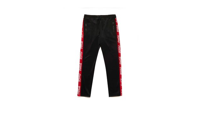 また、ブラックのジップアップ・ジャージトップスとパンツはコントラストの効いたコカ・コーラレッドが遊び心溢れるアクセントに。テーパードシルエットとドローストリングスのディテールがスポーツリュクスな演出を際立てている。