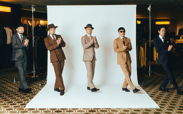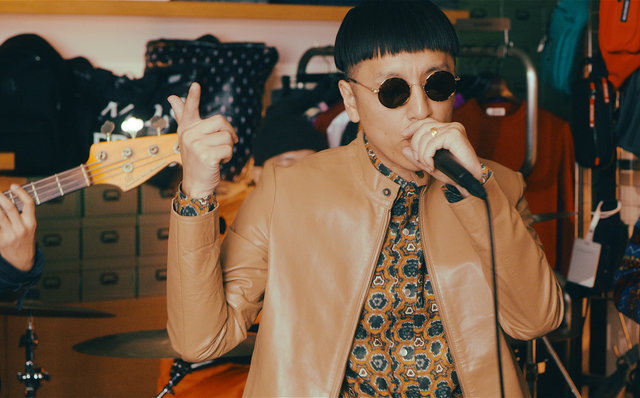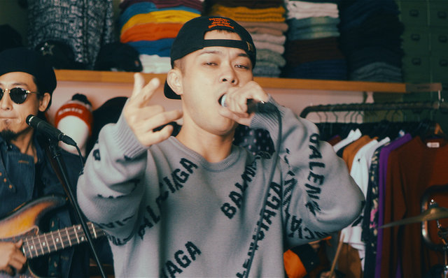 うず高く積まれた廃ブランドのスニーカーから色とりどりのニットアイテム、こだわりのインディアンジュアリーまで、所せましとディスプレイされたカジュアルアイテムの中心で、「韻シスト」の5人のメンバーたちがパフォーマンスを披露。