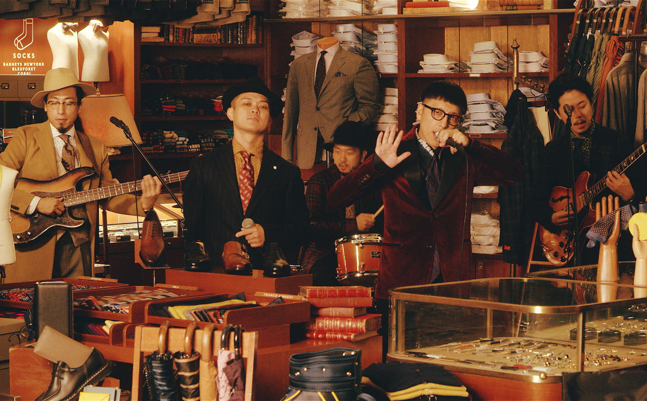 楽曲の中盤からは、もう一つのバーニーズの特徴であるクロージングアイテムに身を包んだ5人が登場。無数のジャケット、個性豊かなネクタイラインナップ、磨き上げられたレザーシューズたちに取り囲まれながら、今度はクラシックなスーツスタイルで縦横無尽に躍動する。