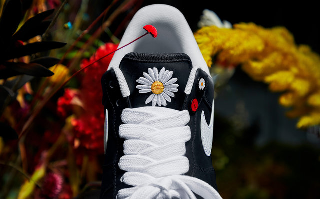 ペイントのほかにもシュータンに施されたデイジーの刺繍や、アッパーのハト目部分に付けられた取り外し可能なカスタムピンなど、スペシャルモデルを印象付けるディテールが散りばめられている。