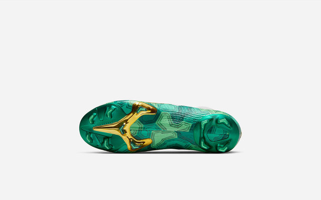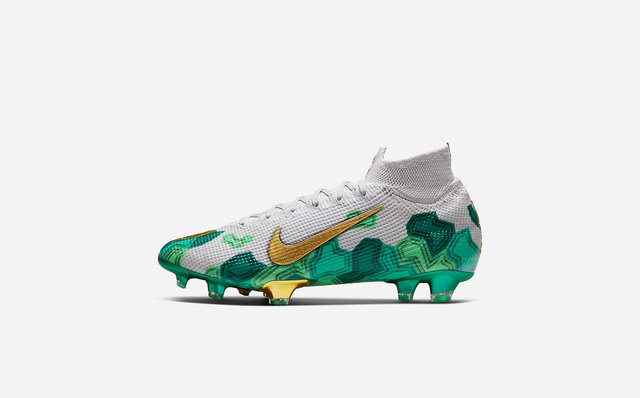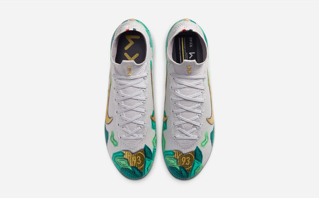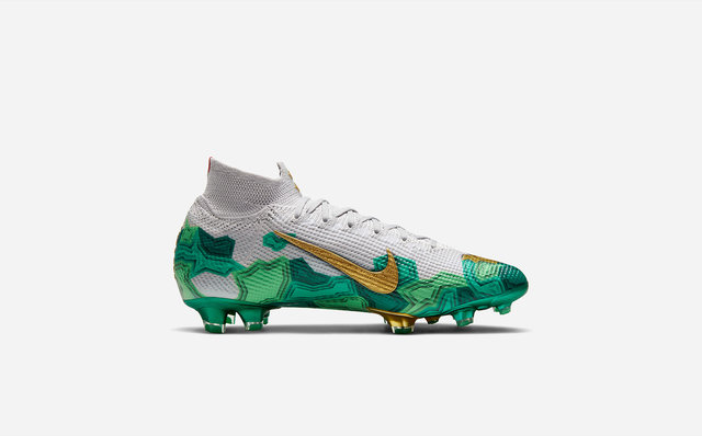 マーキュリアル スーパーフライ 7は、スマートなグレーのアッパーを採用し、かかと、側面と全面に大胆な緑の幾何学模様があしらわれた個性溢れるスタイルが特徴。