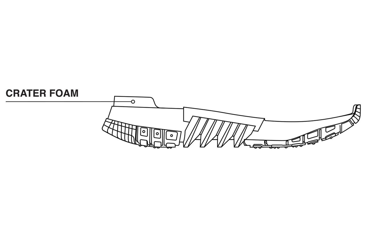 ソール部分は、『クレーター フォーム』で作られており、通常のナイキ フォームにナイキ グラインド ラバーを15パーセント混ぜたものを使用。新しい素材の使用量を減らすことで、炭素排出量も削減できると同時に、ナイキ グラインドの粒が一つ一つのミッドソールで異なる素材感や、色の組み合わせを生み出している。