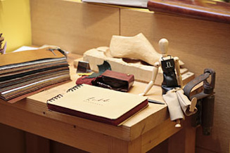 実際のフィッティングでは、まず仮縫い状態(といってもそのままでも仕上げられる最上級の革を使用)の靴を両足とも履き、当たる箇所をマーキングし、トゥ、かかと、サイドなどにカッターを入れて、中の状態を確認し修正していく。